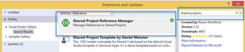 Since manually editing a .csproj is no fun the good people at Microsoft created a Visual Studio extension called the “Shared Project Reference Manager Extension”, which you can find on the Visual Studio Gallery. You can get to this from “Tools -> Extensions & Updates -> Online” and search for Shared Projects: