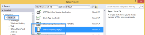 Once you have this installed you can simply do a File->New Project and under C# you will see a shared project!