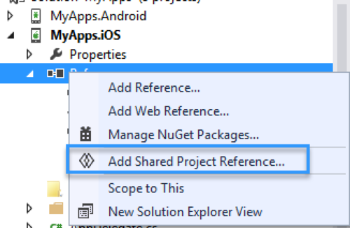 With your shared project in place simply right click on your “References” of your Xamarin iOS or Android app and you will see a new “Add Shared Reference…” entry in the context menu. After that you are all set and ready to share code. Of course there is nothing special you need to do in Xamarin Studio as it just works out of the box :)