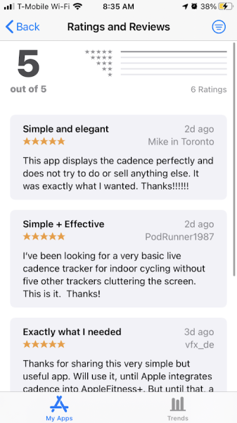 I know what you are thinking, but James everyone hates those pop ups asking for reviews. I agree with this statement, but only when the request for a review is not handled properly. For example, I got a request to review my banking application before I even logged in! That is annoying and you know that the users is going to cancel and never leave a review. So, when I implement app review requests, I try to be clever about it track a main action that the user is doing. Then after so many times I will prompt them for a review. In the case of My Cadence after 5 successful connections to a sensor when the user hits stop, I will prompt for a review.