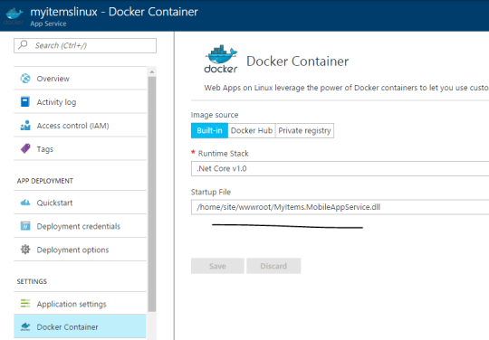 This will go through the standard setup process and bring you in to your standard app service settings. The first thing that we need to do is adjust our Docker Container. We want to select .NET Core v1.0 runtime stack and REALLY REALLY IMPORTANT to set the startup file. This file is the main DLL of our application. We will be uploading our files to the wwwroot.