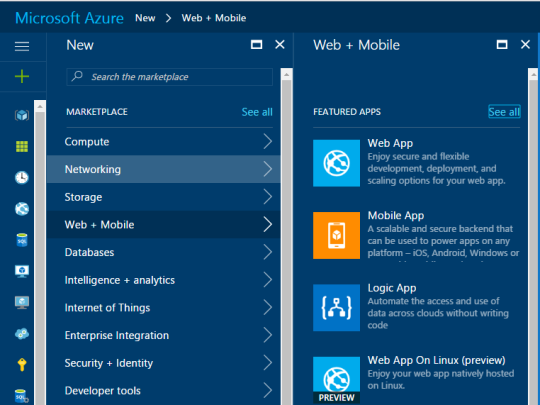 Looking good! Next up, Let’s create our Azure App Service that will run on Linux (in preview today). Head to your Azure Portal and hit New -> Web + Mobile + Web App on Linux (preview):