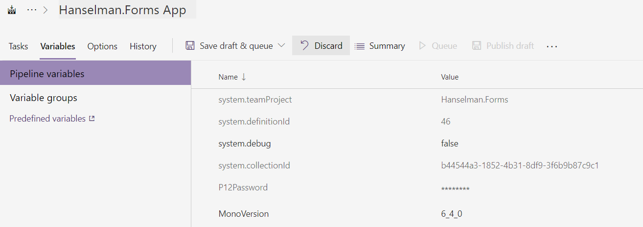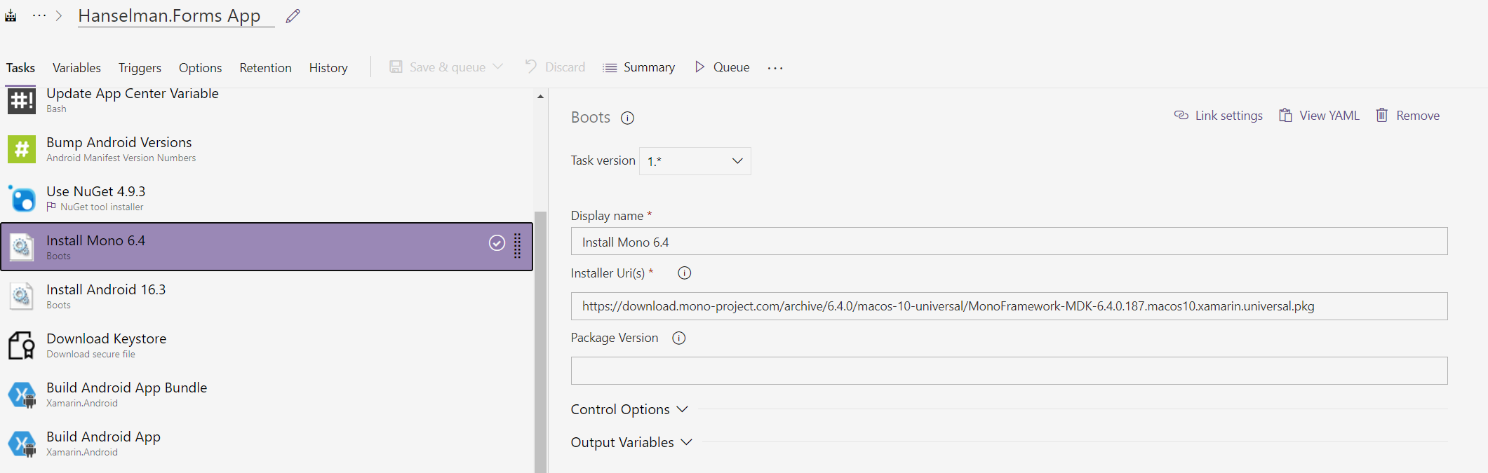 This next task is very important as it will tell the build agent what version of Xamarin and Mono to use when compiling the app. I like to define a variable with the version number in the format Major_Minor_Revision. For the latest we will use 6_4_0: