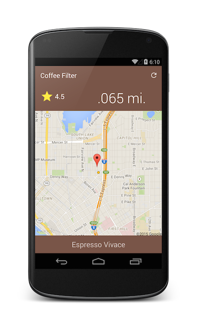 I love coffee. You will normally find me riding my bike around Seattle stopping from coffee shop to coffee shop indulging in a 8oz quad lattes, strong black coffee, or probably a shot in the dark. So when I set out to blog about the new Google Maps Lite API it was pretty obvious what I needed to do… create an app showing me the closest coffee shops around me. In that moment Coffee Filter was born! What was interesting to me and hopefully to you was how I was able to think up Coffee Filter, design, implement, test, and ship to Google Play in under 48 hours. More than half of those hours I was either asleep or on a plane! Let’s take a look at how it was created.