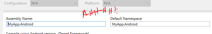 Now, if you are in this space you can solve it! Simply change your default namespace to "MyApp.Droid" in the project settings and also change your namespace in any files in your project to "MyApp.Droid" as well.