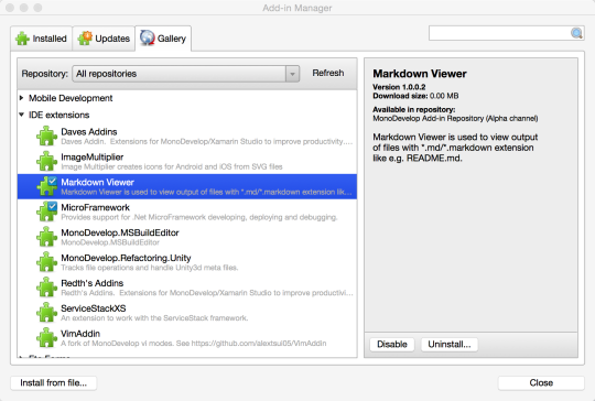 I can’t help myself I really love Xamarin Studio. Don’t get me wrong I still love Visual Studio for everything that it does, but with Xamarin Studio 5.9 the best mobile focused IDE just keeps getting better. However, did you know that you don’t have to wait for new releases of Xamarin Studio to get new features? Xamarin Studio has an entire ecosystem of awesome plugins to extend the IDE and I just stumbled upon one that solves one of my common issues, which is the ability to edit and preview Markdown. I love markdown for its simplicity and I often have to edit readme.md files for GitHub and the Markdown Viewer makes everything LOVELY! So here is how you get it: