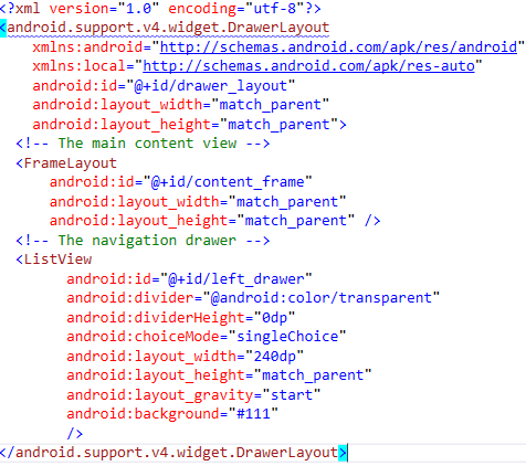 This is the standard layout that Google recommends, which is a “DrawerLayout” as the root object with a “FrameLayout” to contain your main content or fragments that you will swap in and out. After that, you then have a “ListView” which is your actual Navigation Drawer. In this example we will just use a standard list, but you could completely customize it with headers, footers, or change it to something completely different.