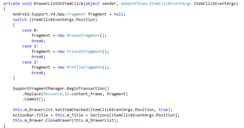 Since we have registered for an ItemClick event “DrawerListOnItemClick” we will implement this method to replace the Resource.Id.content_frame with the fragment that the user has selected based on the position.