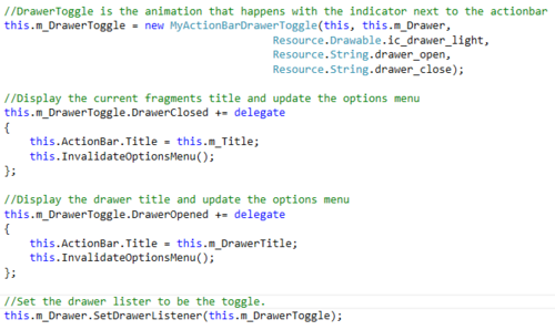 You will want to create a new “MyActionBarDrawerToggle” in your OnCreate, which takes in the current Activity, the icon to use, and a few strings to display if the user long presses on the toggle. After you have created the new Toggle you will want to implement the DrawerOpen and DrawerClosed events to update the ActionBar title and to also update the OptionsMenu. Finally you need to set the DrawerListener for your Drawer to actually listen for these events.