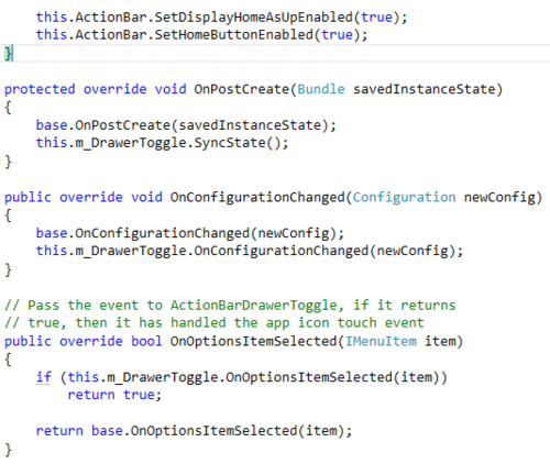 Each DrawLayout has a DrawerListener which is an ActionBarDrawerToggle that is used to notify us when the Drawer is opened, closed, state changed, or had slid open. In the sample you will find a class called “MyActionBarDrawerToggle.cs,” which implements all of the proper methods.
