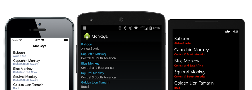 Last week I posted an introduction to Xamarin.Forms article on the Xamarin blog. I went over a simple master/detail flow with a list of monkeys that data bound to a ListView, and then navigate to a detail view displaying more information about the monkey when selected. It was a pretty simple implementation and I wanted to dive deeper into adding functionality.