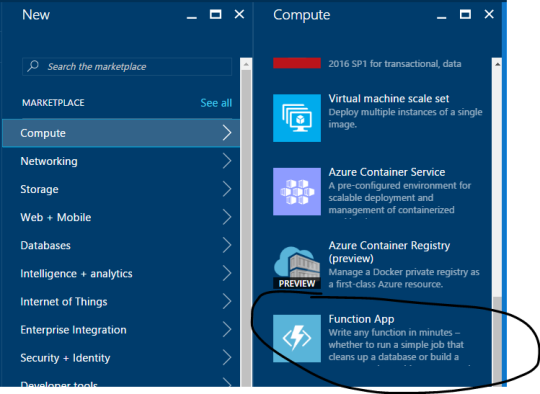 Let’s create a function app! So easy, peasy, basically New -> Compute -> Function App. Fill in a bit of information and this Function app contains a suite of functions inside of it. I like to group all functions for an app together.