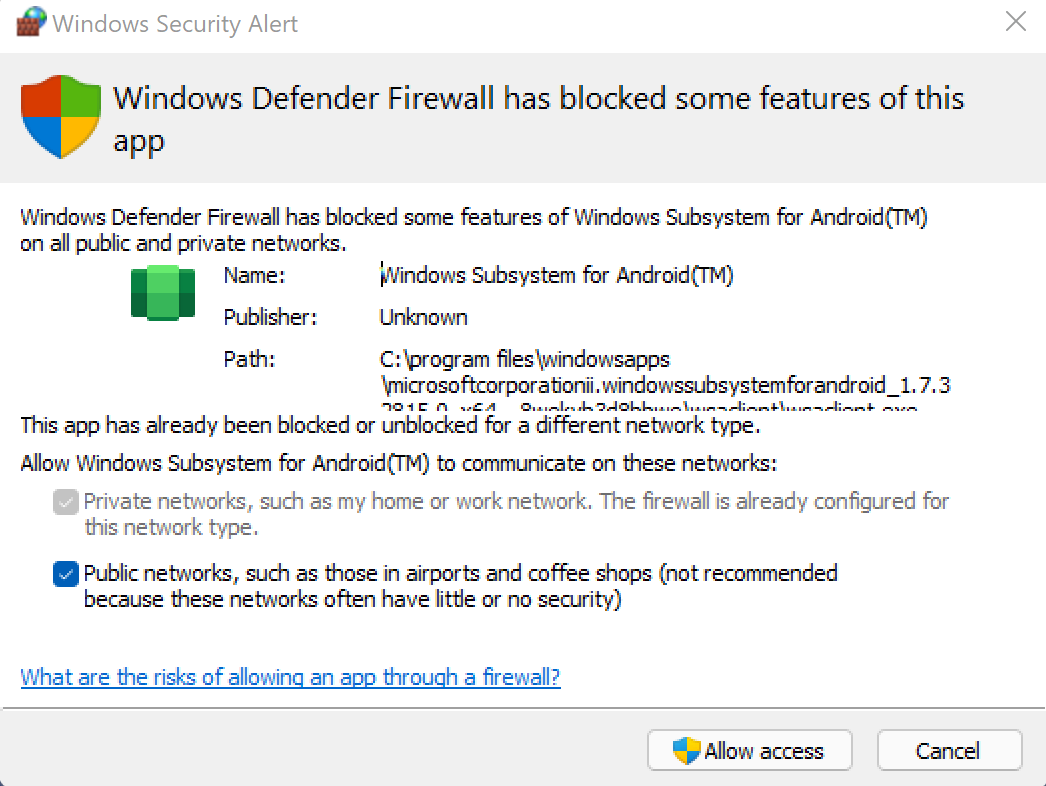 There are a few things to be aware of with WSA. There is no Google Play Services, so if you are testing out maps or other services that is not going to work. It isn't an emulator, which means you don't get to control the skin or conditions under where your app runs since it is running under WSA, not an emulator. Not every sensor is connected, for example it looks like Bluetooth isn't forwarded to WSA from your Windows machine. I also haven't found a way for apps running under WSA to talk about to the local machine for debugging web servers, but I am sure it is a matter of time before someone figures it out.