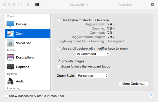 Even though you have adjusted to nice big beautiful fonts it may not be enough some times when you need to highlight and show off your solutions projects or need to highlight something small on the screen. This is where zooming comes in! Learn to master the zoom tools on both Mac and PC and you will surely impress all of your attendees. On Mac OSX, it couldn’t be easier to setup, just go into Accessibility, Zoom, and turn on zooming with a Command + 2 finger swipe in and out. Practice this though so it is a small, slow, and steady zoom so it isn’t jarring for your attendees.
