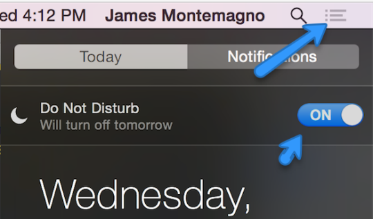 There is nothing worse than an email or twitter notification popping up during a presentation! We have all seen it happen as it is easy to forget to hit that little switch in Mac or Windows to disable all notifications. Usually when screen mirroring this is done for you, but why risk it? Simply turn everything off. On Mac OSX simply hit that odd little trip line on the very very top right of your screen. This will bring out your notification center with a hidden setting you can get to by scrolling/pulling down to put your machine in Do Not Disturb mode (similar to the iPhone).