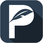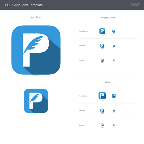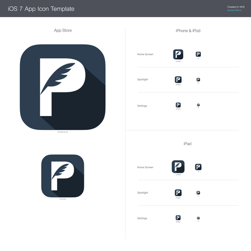 Based on the first mock ups, I knew that this was my guy and hopefully I could get a few more revisions out of the deal. The thumbs up was pretty great, but didn’t fit the app perfect. However, the P with the quill was beautiful and we both agreed that dark blue was the best option of the bunch. We went back and forth a bit on the design and came up with 2 great designs. First was his favorite design without a drop shadow: