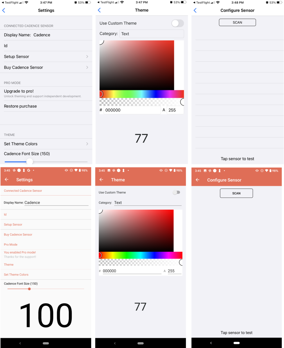 }Beyond that I just had to change a few settings for background colors and sizes of buttons and progress bars and then the app was ready to go. Here is a side by side of the app on Android and iOS.