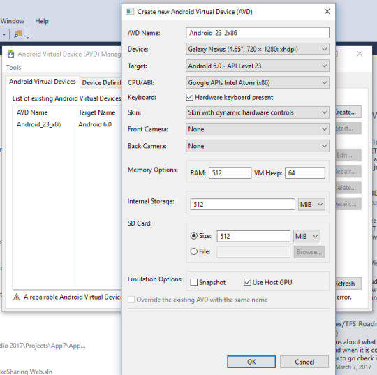 I hear you yelling right now, JAMES I NEED MY HYPER-V!!!!!! Alright fine, then don’t install HAXM and install the Hyper-V VS Emulators for Android! Now there are some things to know with these. First, they are pretty nice and fast emulators. Second, you aren’t going to get the latest and greatest as they haven’t been updated in a while. Third, if you are running a Skylake or newer processor you need to turn on compatibility mode or your app will fail to debug. Lastly, there are no google play services or maps on them unless you hack around it and install gapps with this awesome guide.