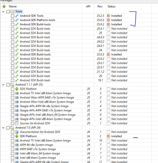 The installer sets us up for success with SDK 23 and the build tools needed, but I like to install the latest and greatest for API 24 and optionally you can pick SDK Platform 25: