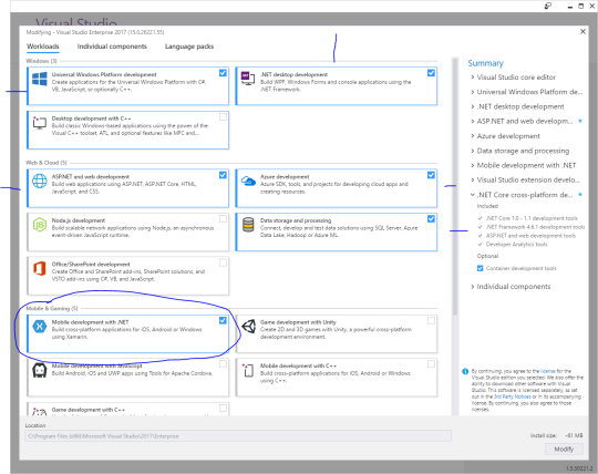 The installation is brand new and pretty awesome. You now pick “workloads” of development that you want to install and it will take care of the rest. It is highly configurable, but the default for me of installing tons of stuff was super fast and installed in under 30 minutes! If you just do the core VS 2017 install it will be installed in under 5 minutes! That is crazy. For Xamarin development there is literally a Xamarin checkbox under mobile, it is the first choice and really the only choice you need: