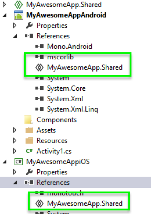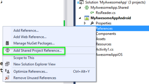 Then you can add in your iOS and Android apps like normal. Once you want to start writing code in your Shared Code Project you will want to add them as a reference to your other projects so you can get intellisense and bring in namespaces.