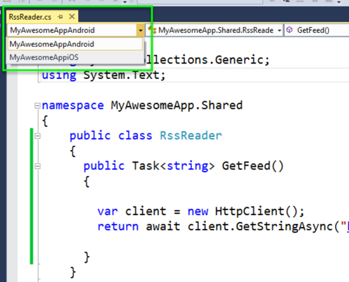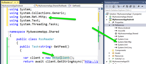 This means you will probably have to do a lot of toggling between everything to make sure it compiles correctly, but it is pretty slick. So now if I wanted to add HttpClient into the mix here I would add the reference to my iOS and Android project like I normally would, and then start writing code in my Shared Code project: