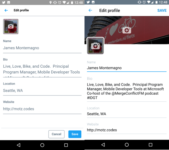 Profile Screen - (Twitter Lite on Left, and Twitter App on Right)