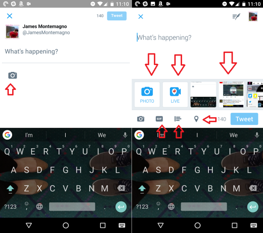 What we notice is that poor Twitter Lite has a single button and a weird layout to send a tweet (that tiny tweet button up there is weird!!!!). Over on the main app, it is tying into my recent screen shots, I can take a photo, add location, add a gif, and has a proper sized tweet button.