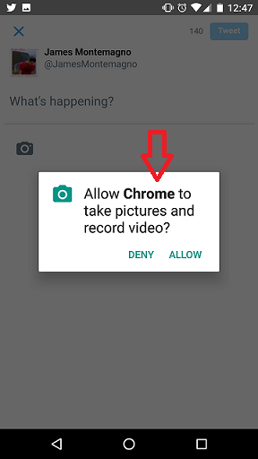 I mentioned that on both clients, you could take a photo with your tweet. This is nice and websites also have this capability to a certain extent based on the browser, but on iOS and Android there are strict restrictions on permissions. This means when you actually go to take a photo, you are prompted for permission from CHROME, not Twitter Lite: