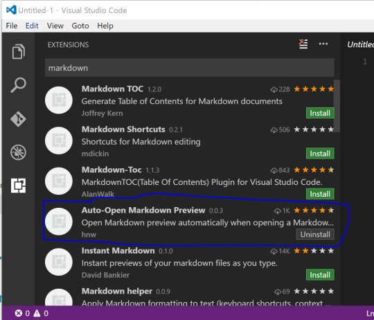Simply searching for “markdown” gets you into a world of trouble as there are tons of hits all with no icons or real reviews or downloads. Do not worry because I have done all the hard work for you and test a bunch of them out and the one we want to install is “Auto-Open Markdown Preview” (currently version 0.0.3), because it is AMAZING.