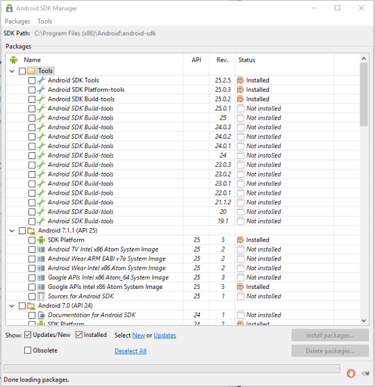 - Android SDK Tools 25.2.5 (you may not see this at first, but keep updating the top SDK Tools and eventually it will show. You may have to close and open the SDK manager a few times)